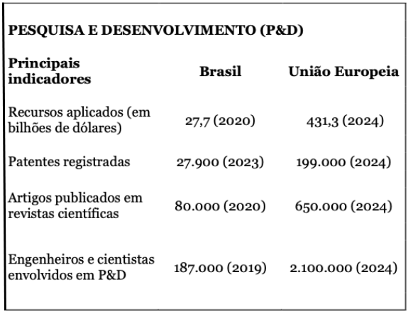 A tabela a seguir mostra essa triste realidade. Com alguns indicadores, compara-se os sistemas nacionais de ciência e tecnologia do Brasil e da União Europeia. O Brasil representa cerca de 75% de toda a atividade de P&D do Mercosul. Embora os dados sejam referidos a períodos um pouco divergentes, o conjunto expressa bem o atraso brasileiro.