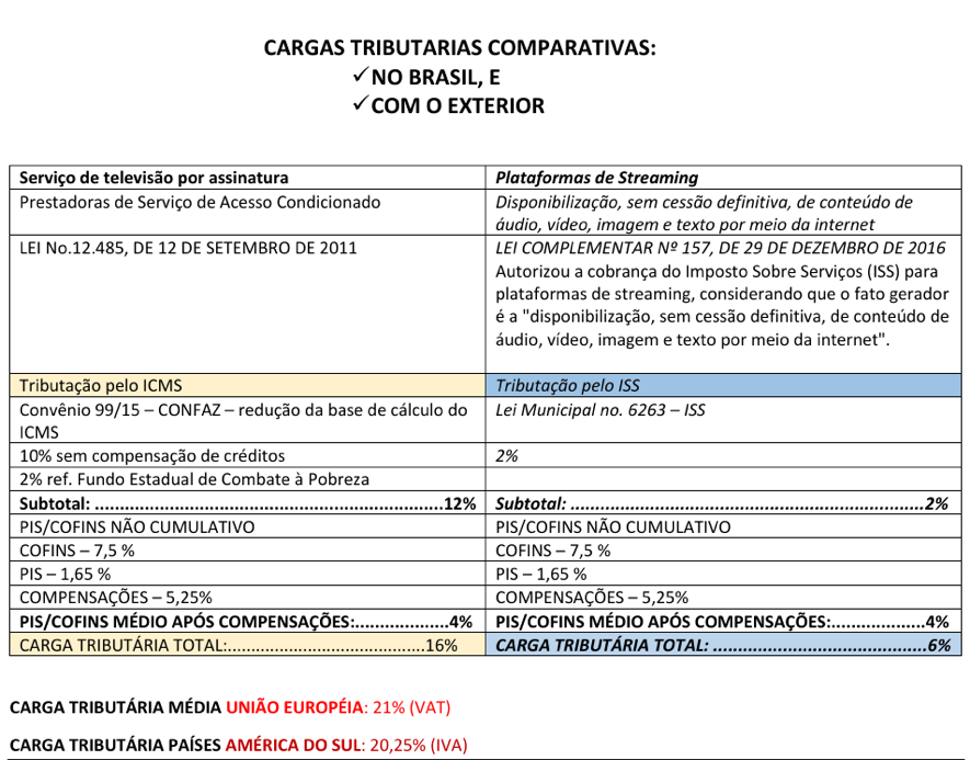 – Correção da tributação exageradamente benéfica ao VoD, tanto em relação aos segmentos concorrentes, quanto na comparação com outros países; sua carga tributária se situa entre um terço e metade da dos demais países.