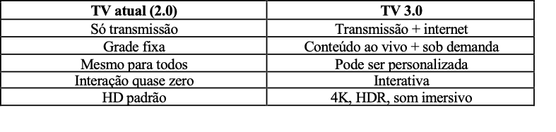 A TV 3.0 permite recomendações de programas, publicidade direcionada (tipo a da internet) e perfis de usuário na TV da casa. Isso é uma mudança gigante para a TV aberta, que sempre foi igual para todo mundo.