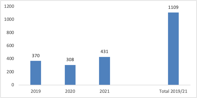 O gráfico abaixo nos informa os valores anuais e totais com pagamento de juros, relativos ao triênio 2019/2021.